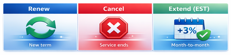 Three end-of-term options: Well before a subscription ends, decide to renew (keep using it), cancel (end service at expiry), or extend (go into EST).